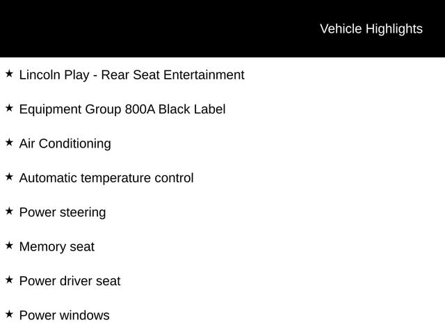 Lincoln Play - Rear Seat Entertainment, ABS brakes, Air Conditioning, Alloy wheels, Automatic temperature control, Equipment Group 800A Black Label, Memory seat, Pedal memory, Power driver seat, Power Liftgate, Power moonroof: Panoramic Vista Roof, Power steering, Power windows, Rear Back Up Camera, Remote keyless entry, Steering wheel memory, Steering wheel mounted audio controls, Venetian Lthr Htd/Ventilated Captain's Chairs (B).